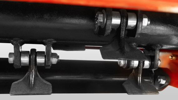 На роторе установлены ножи молоткового типа, от 12 до 24 штук в зависимости от модели. Такие ножи используются для более тяжелых условий эксплуатации. Они отлично справляются с измельчением сырой травы, густых кустарников, небольших веток и других пожнивных остатков.