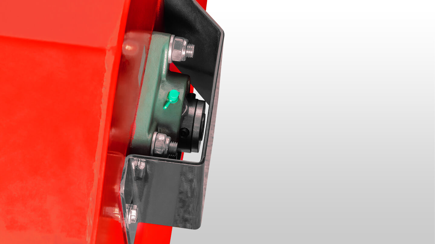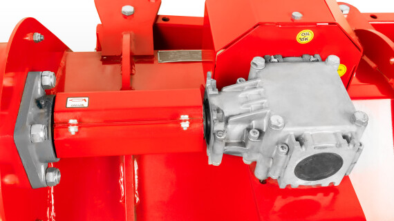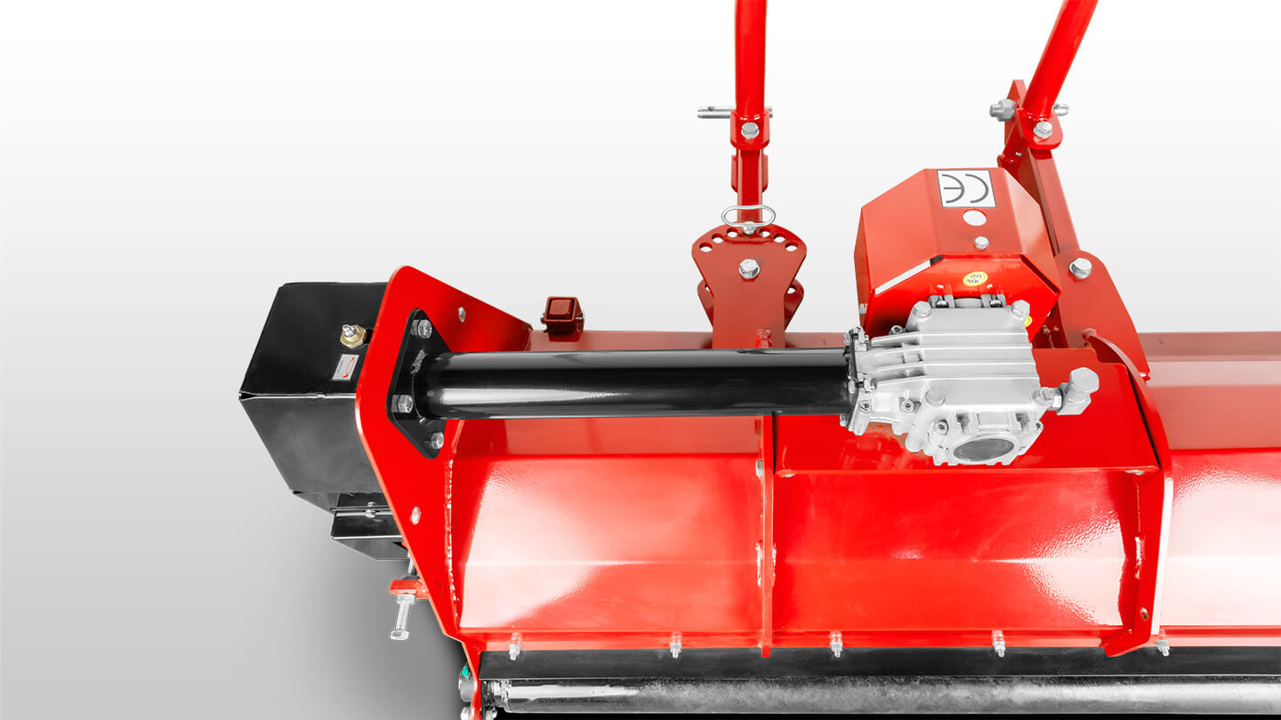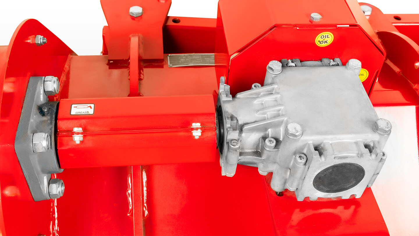 Привод от ВОМ трактора осуществляется через угловой редуктор и двух ременную передачу. Алюминиевый корпус редуктора не утяжеляет конструкцию и лучше отводит тепло при длительной работе. Редуктор с храповым механизмом позволяет снимать нагрузку с трансмиссии трактора в случае резкого снижения оборотов двигателя или его резкой остановки. Двух ременная передача с регулируемым натяжением обеспечивает плавность передачи крутящего момента на ротор и уменьшает возможные вибрации.
